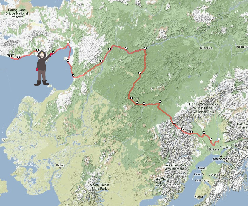 Once at White Mountain, everybodies have a mandatory 8-hour layover, and then its off to Safety, where we hope Richard has obtained (through legal means) a snowmachine and can report to us.