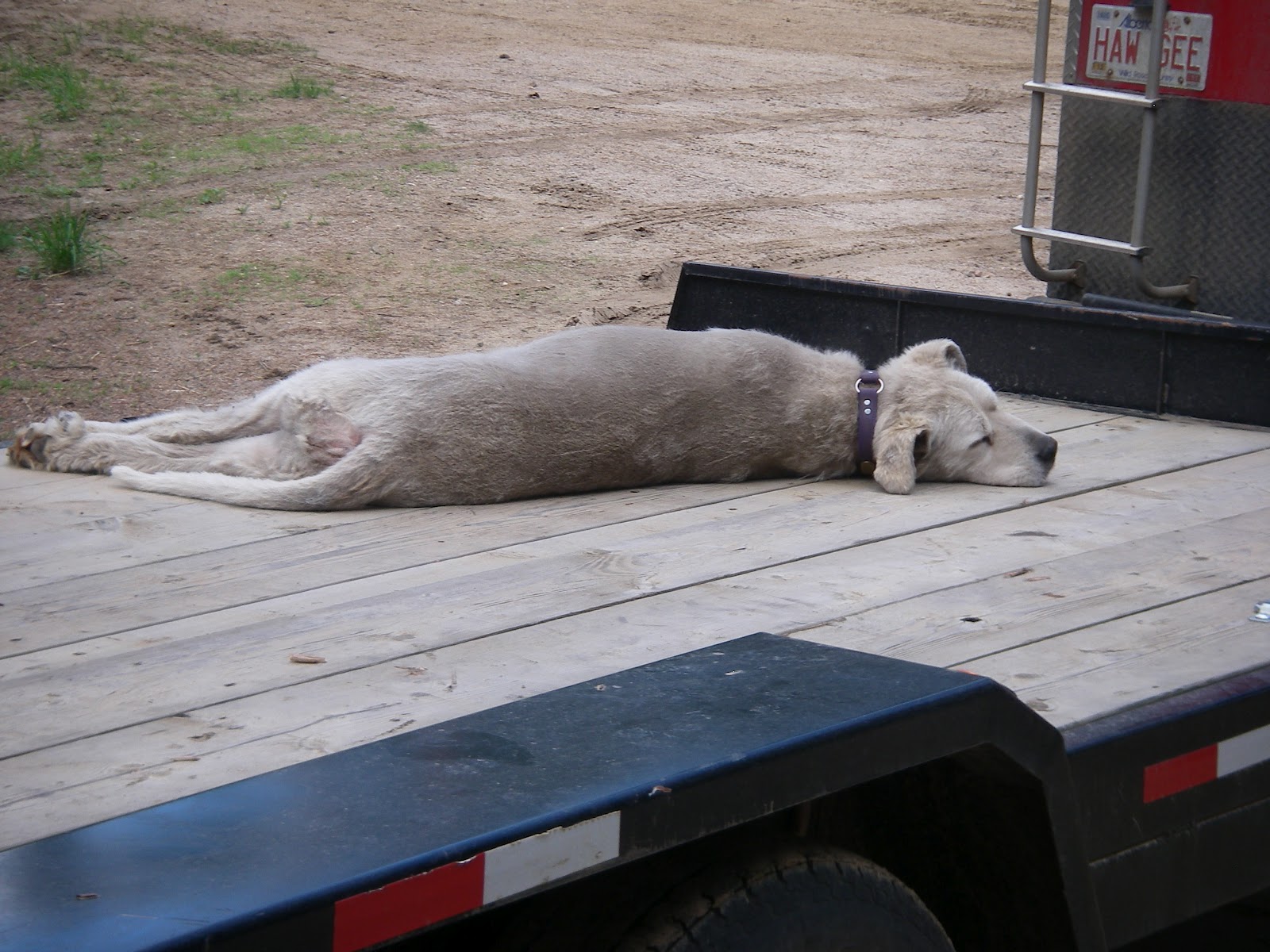 Yesterday, after we unloaded 120 bags of dog food from the trailer I walked up to the house to have a cup of coffee and when I came back outside the solution for my 'get Cricket to the Groomer/Vet' presented itself....
